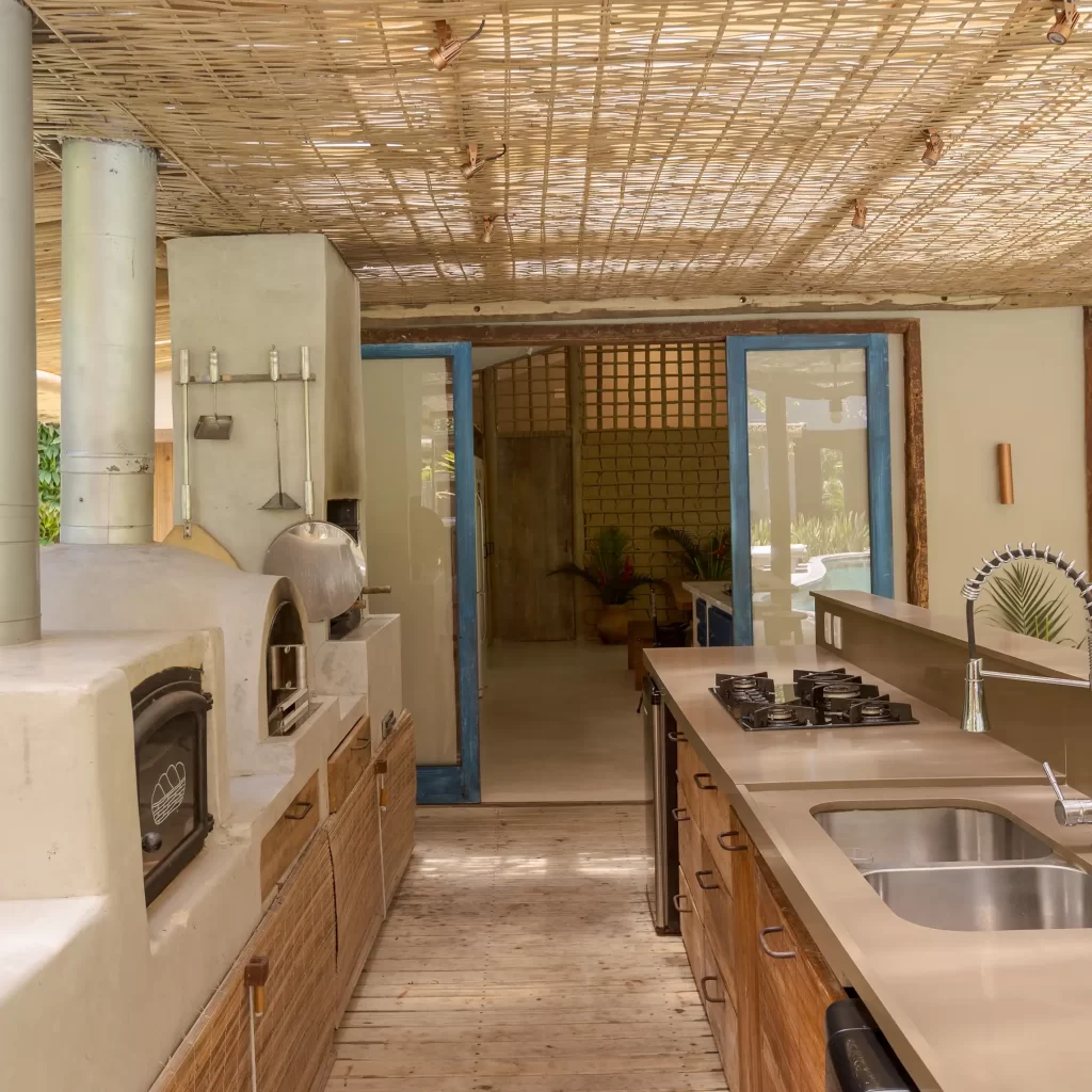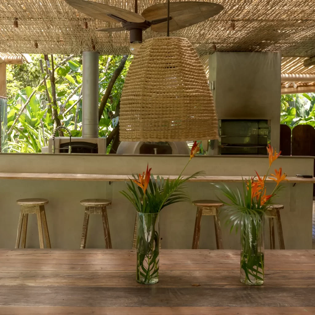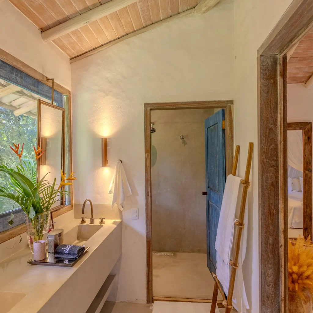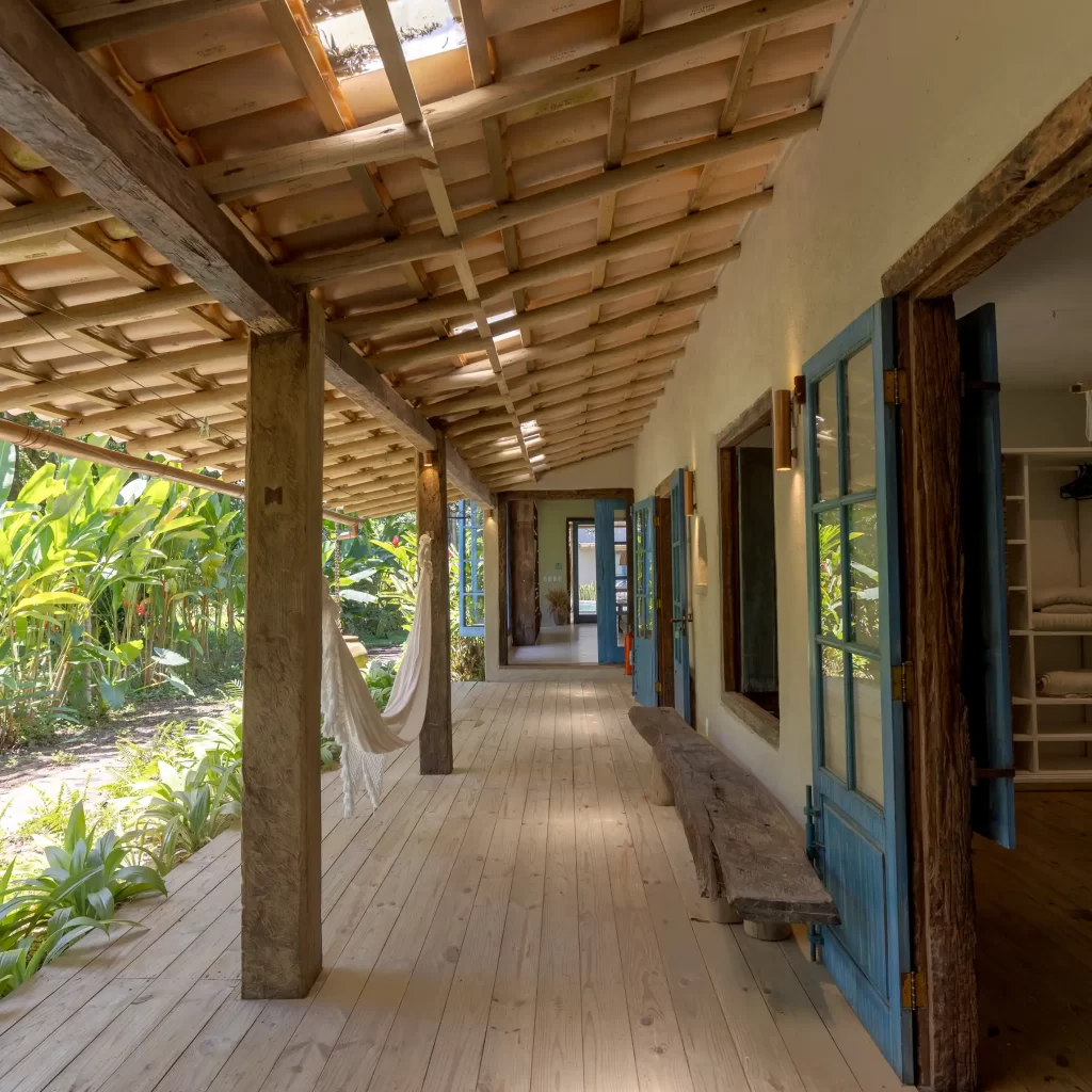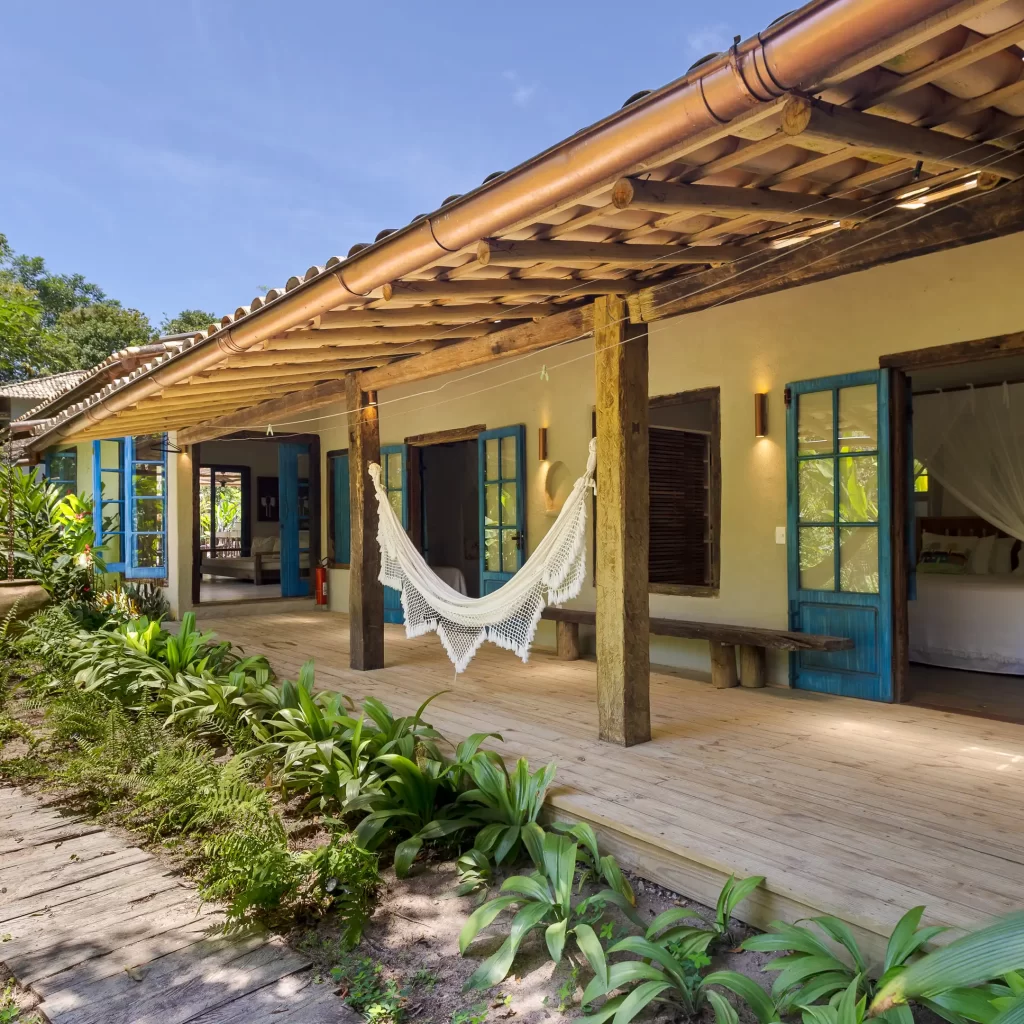 A casa nasceu do sonho de construir, neste lugar magnífico, uma residência que contasse um pouco da história da arquitetura popular baiana, amplamente inspirada na arquitetura colonial. Destacam-se portas e janelas provenientes de antigos casarões, assim como vigas e pilares, todos feitos de madeira nobre reaproveitada de demolições de construções antigas.