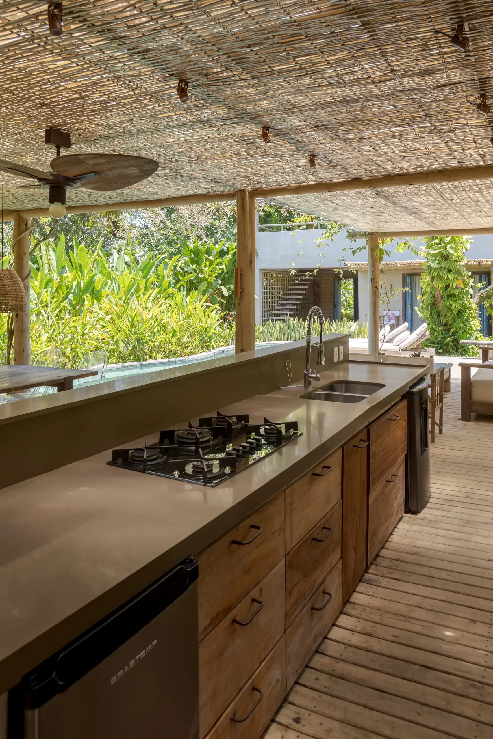 Assim, surgiu uma construção linear, com amplas aberturas voltadas para o jardim e uma varanda. A área íntima é composta por cinco suítes bem iluminadas e arejadas. O descanso e o lazer estão garantidos, pois a casa dispõe de piscina com hidromassagem, spa, cozinha gourmet, churrasqueira, forno para pizza, forno à lenha e ducha externa.