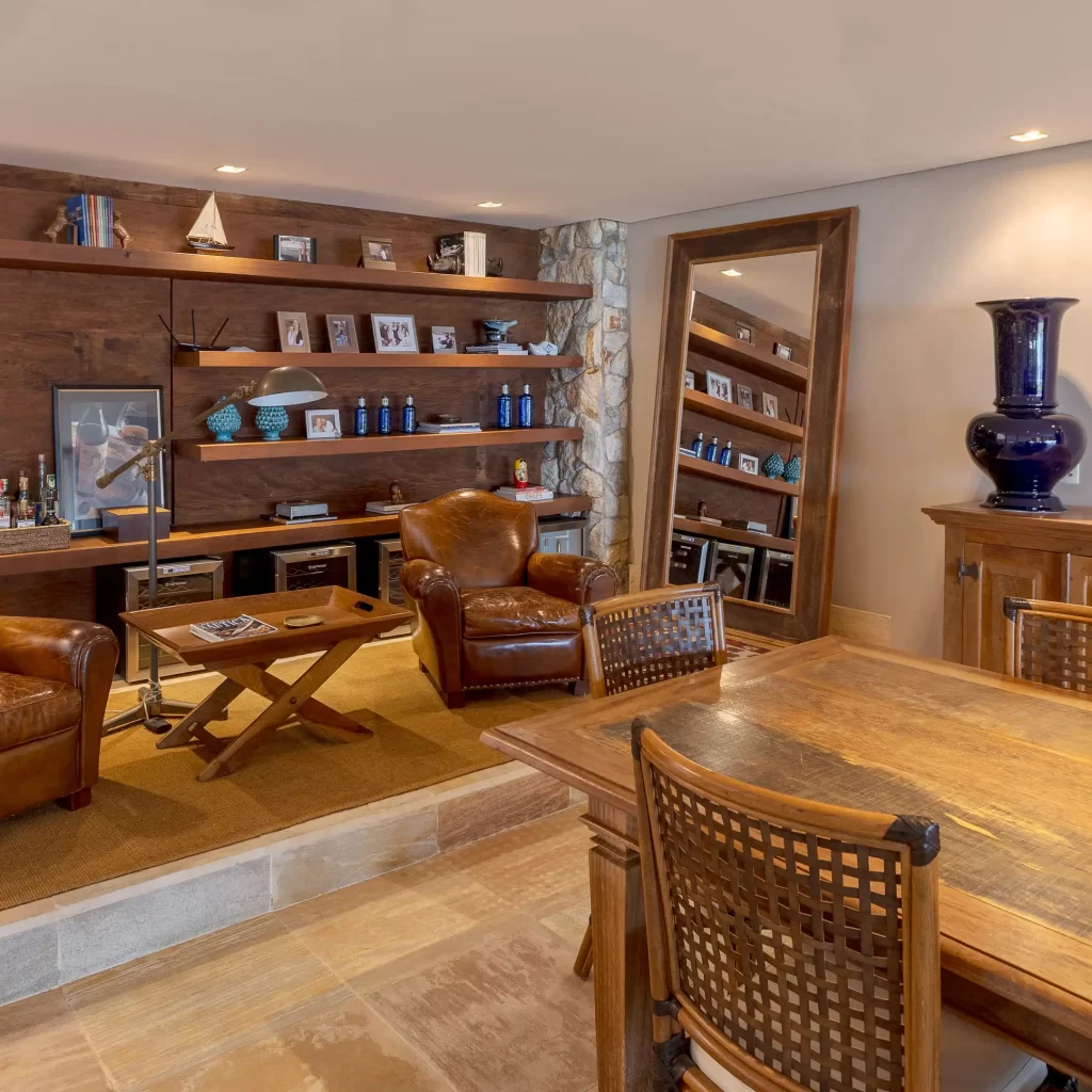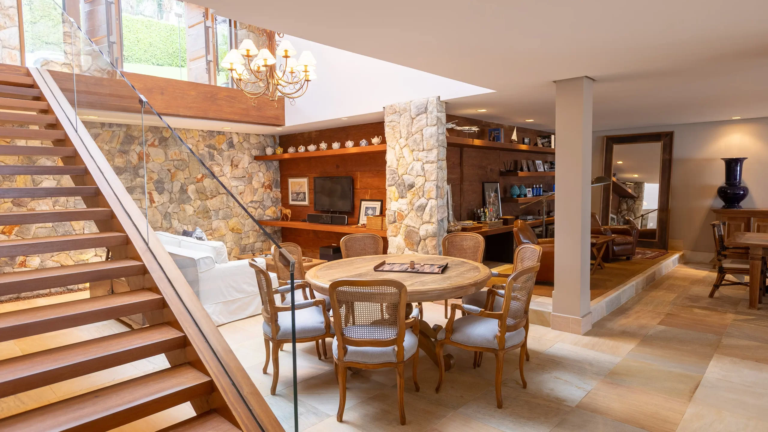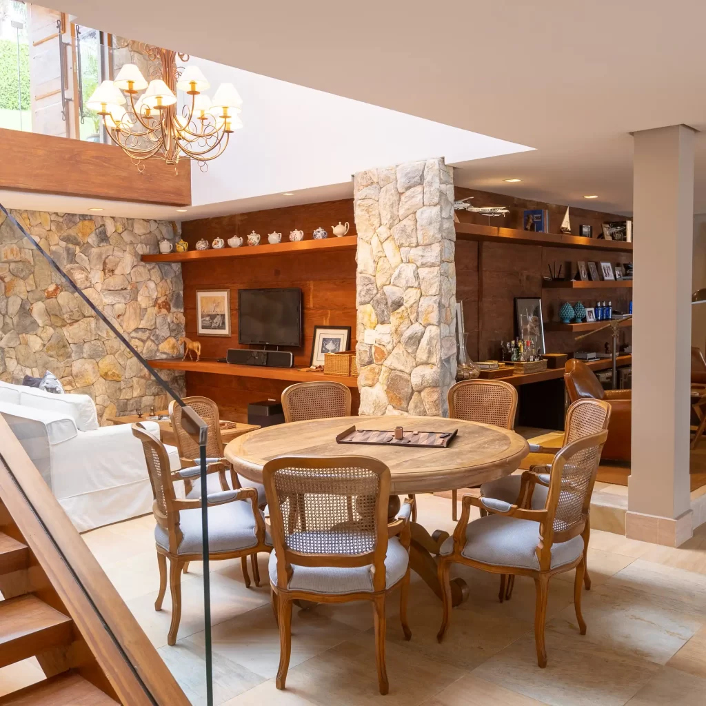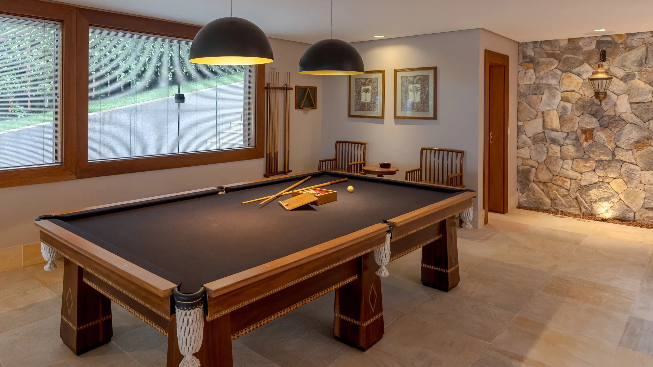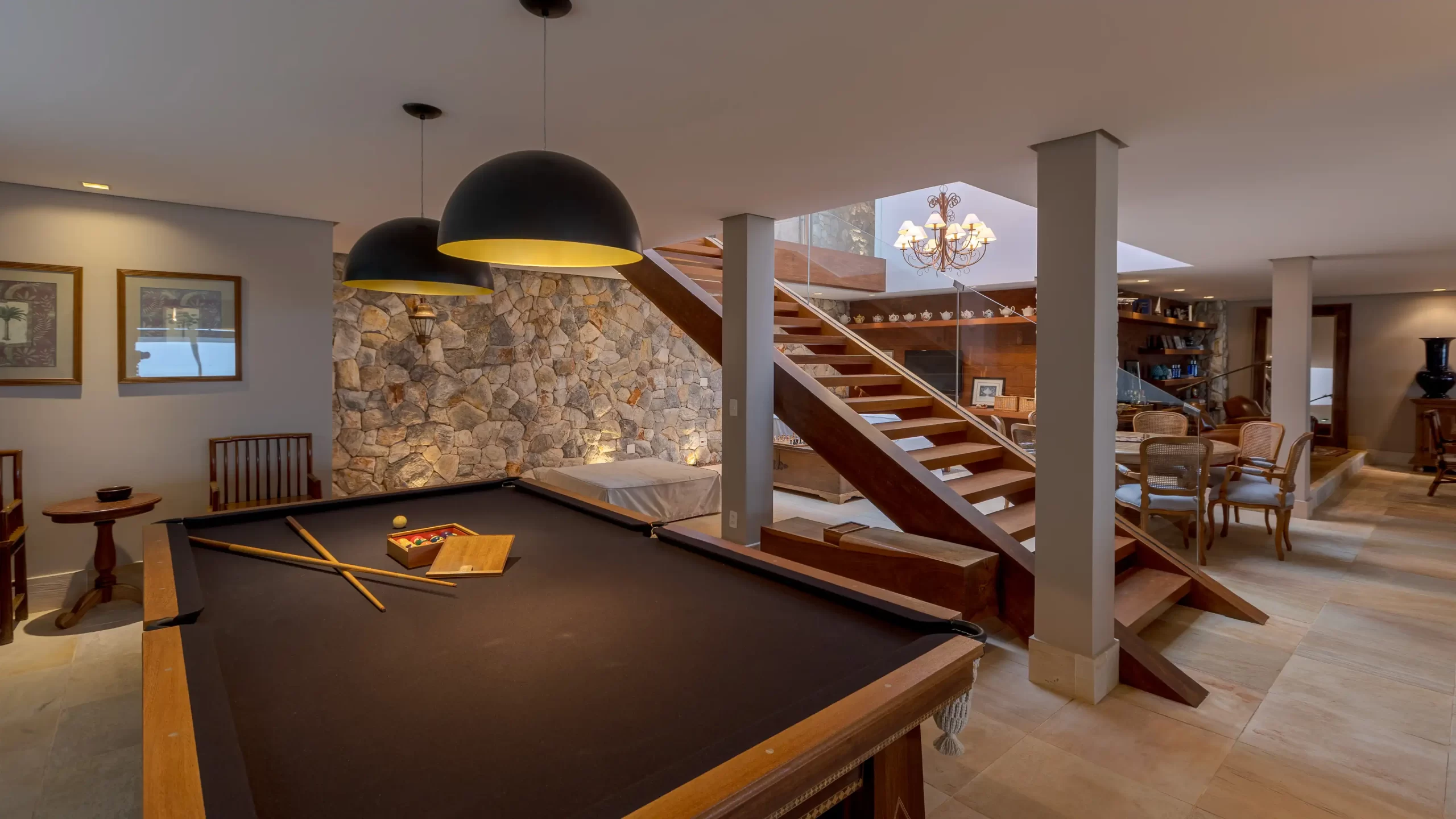 - Ambientes integrados: sala de TV, sala de jantar, sala de jogos e cozinha finamente equipada;