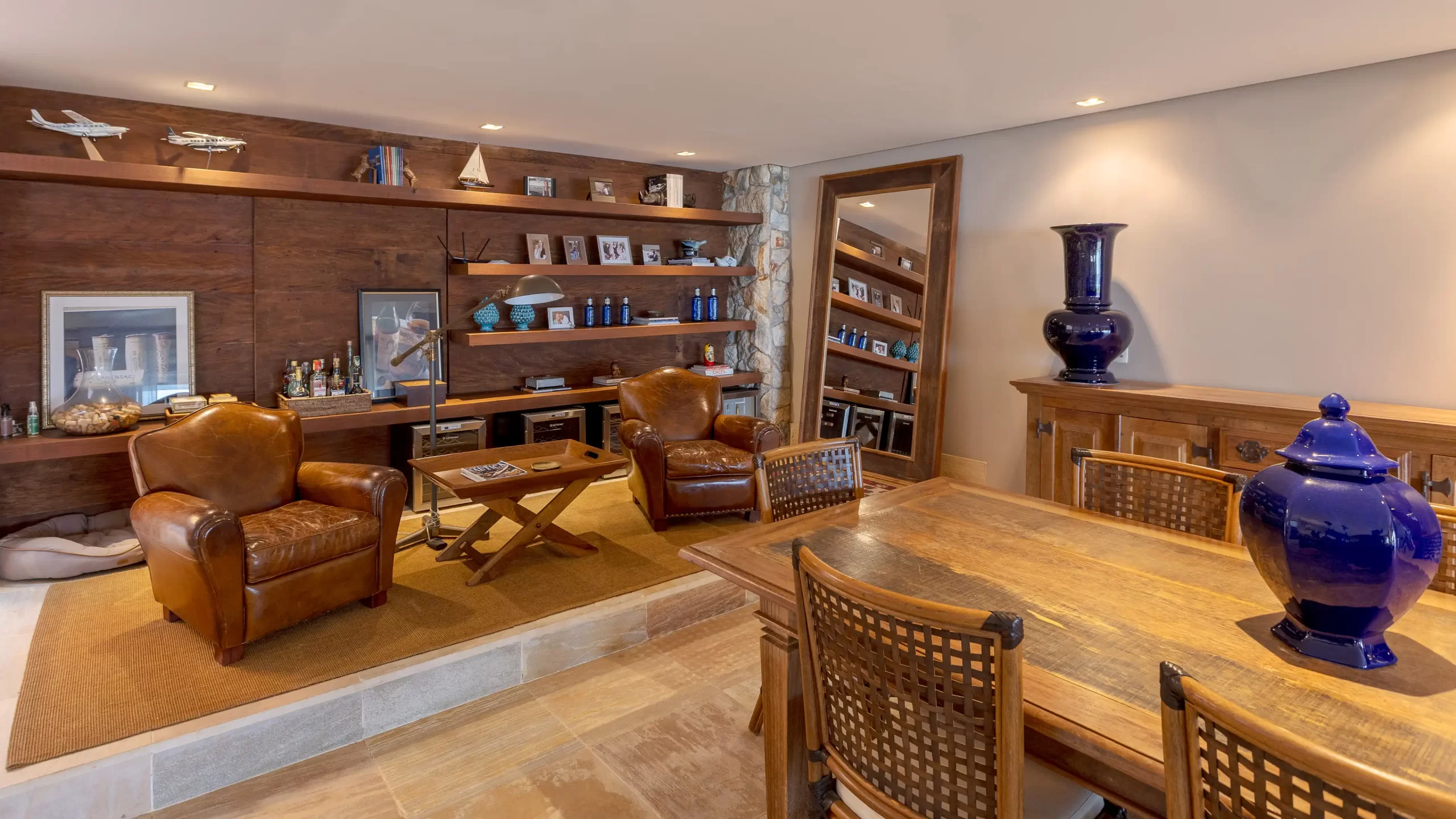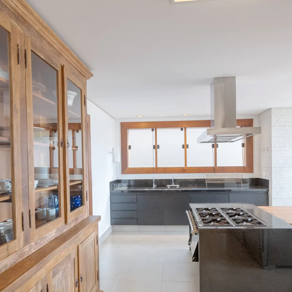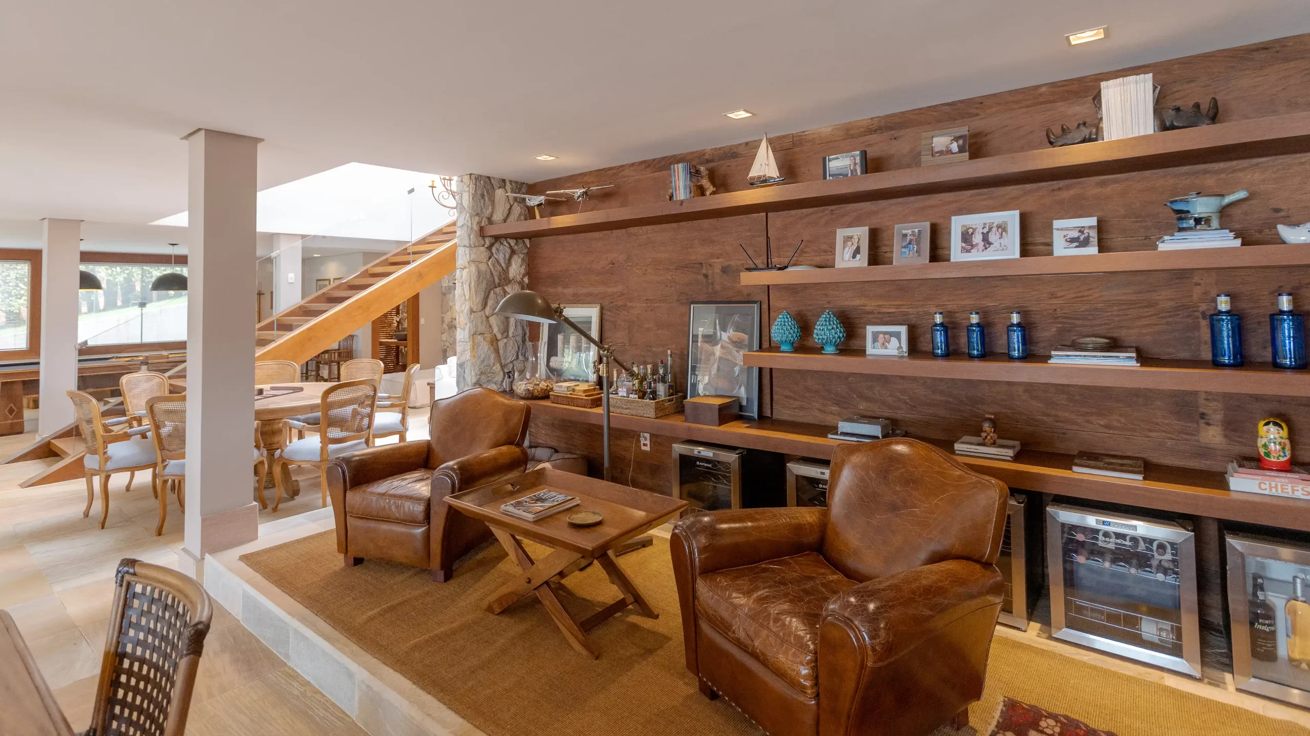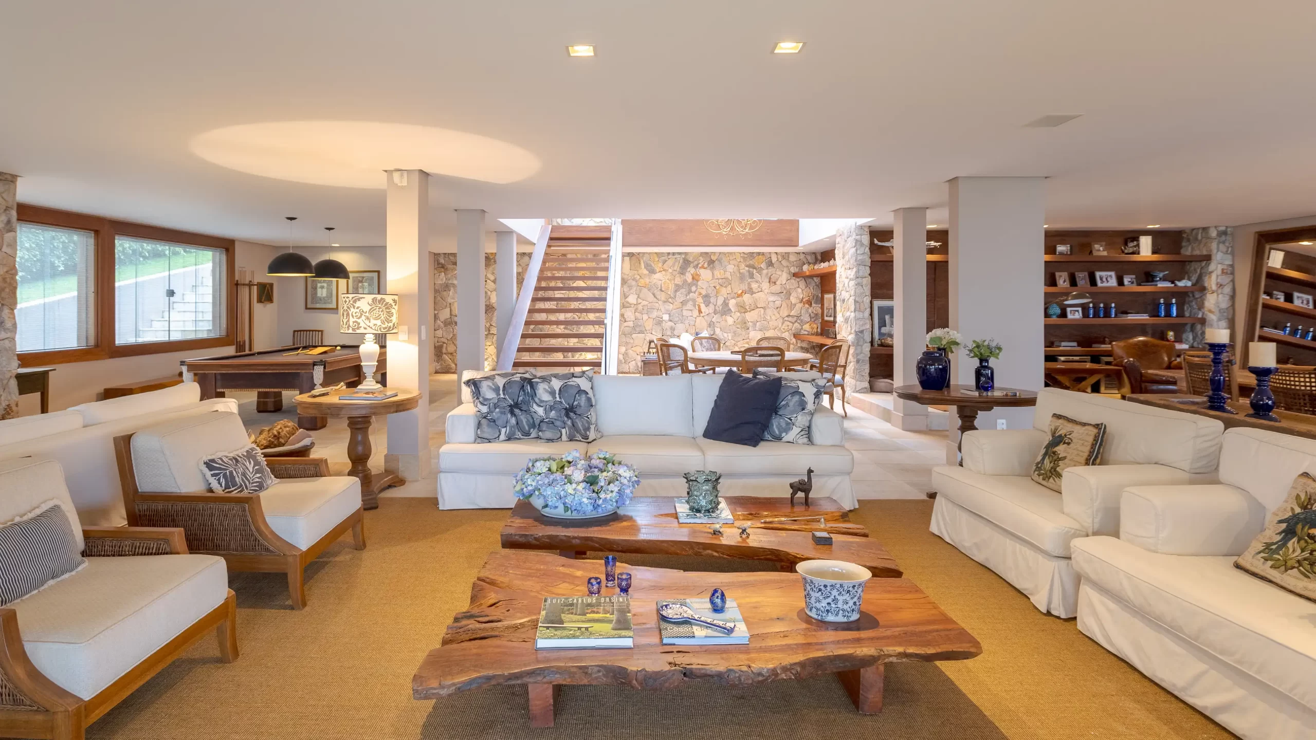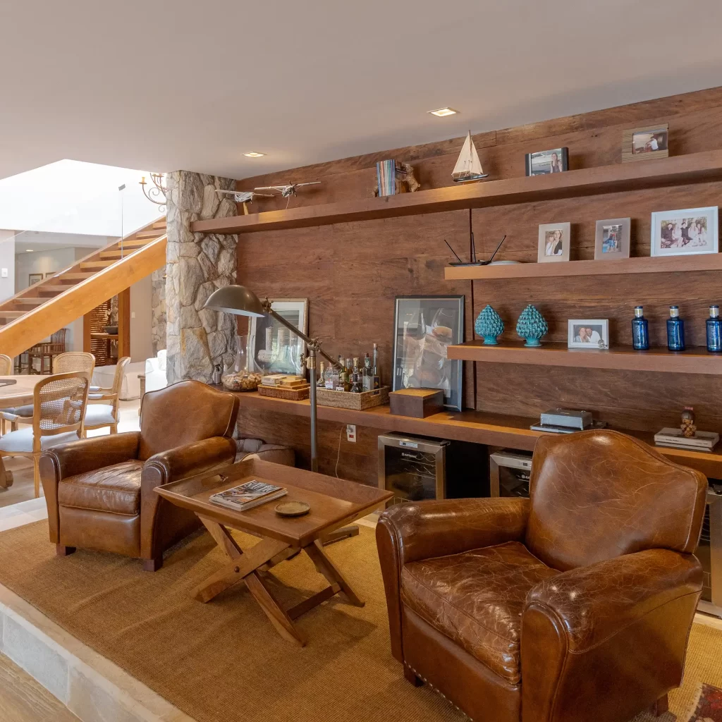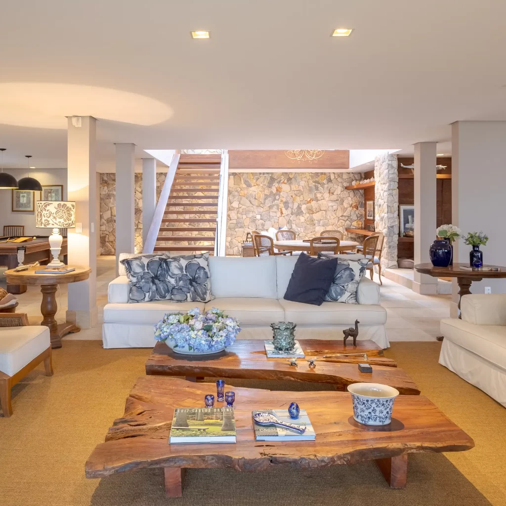 - Ambientes integrados: sala de TV, sala de jantar, sala de jogos e cozinha finamente equipada;